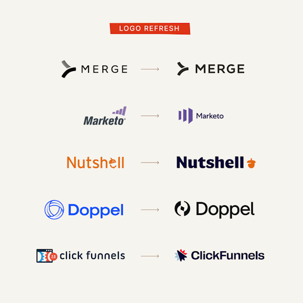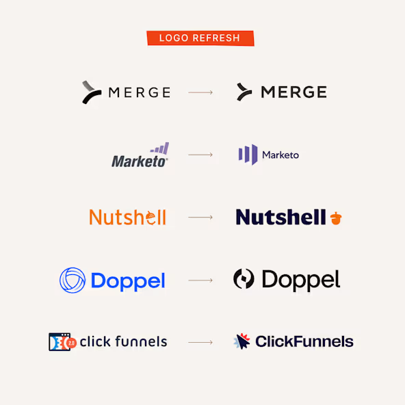 On the other hand, a rebrand could see a logo undergo a wide spectrum of changes. Sometimes the logo performs well and it’s barely touched, while the entire visual identity around it is overhauled. Other times, the logo is changed completely. And of course, sometimes the change is somewhere in the middle; there might be elements of the original logo still present, but it feels fresh and new. Our work with ClickFunnels is a great example of the latter. We kept the red and blue gears of their old logo but broke them out of their previous browser window and into something new. {{dual-image}}