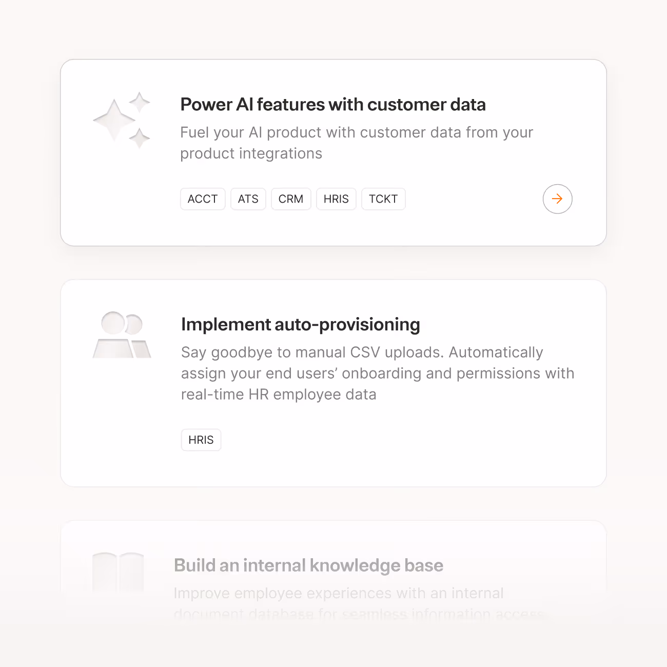 Icons build on the foundation of Font Awesome 6 Pro but were adapted to reflect a distinctive embossed treatment. The choice of emboss and deboss wasn't arbitrary; it carries a dual meaning. Just as the platform embeds itself into a customer's stack to power integrations behind the scenes, the icons don't sit on the surface — they’re inherently ingrained. The technique signals a premium, high-end aesthetic while simultaneously expressing the idea of something pressed into the material itself, permanently part of it.
